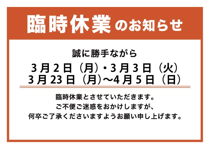 平素より格別のご愛顧を賜り、誠にありがとうございます。誠に勝手ながら、下記の日程を臨時休業とさせていただきます。 【臨時休業日】 3月2日(月)・3月3日(火)3月23日(月)〜4月5日(日) ご不便をおかけいたしますが、何卒ご理解のほどよろしくお願い申し... -